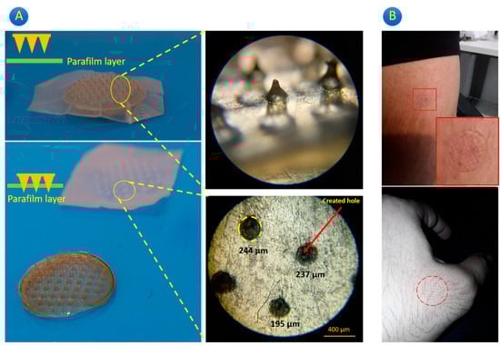 Following the recommended protocol by Rezaei Nejad et al., with a little modification, parafilm was nominated to test the penetration of the MNP. A piece of parafilm in 2.5 × 2.5 cm2 was prepared. The patch was placed on the film and pushed by hand. This test was repeated three times and the number of created holes was counted [21].