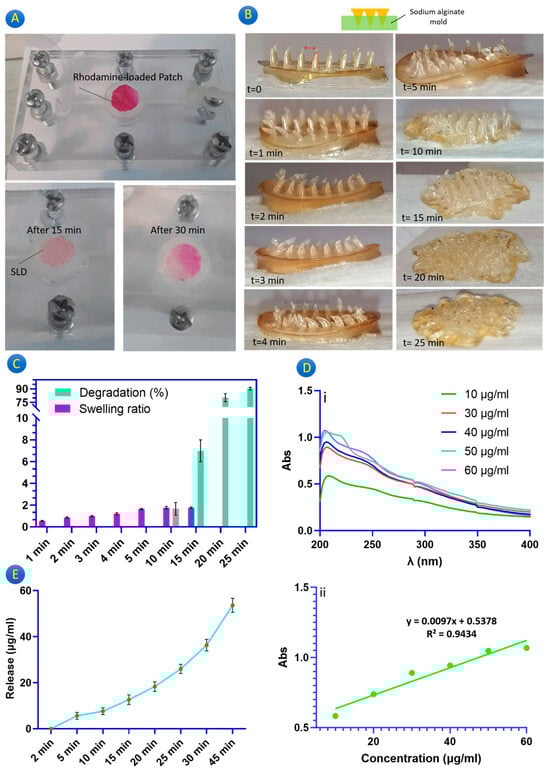 (A) Rhodamine release in SLD matrix evaluation using a microfluidic system, (B) visual approach to monitor swelling of microneedles, (C) swelling and degradation behavior of the GgE-loaded MNP, (D) release standard curve, (E) release profile of GgE from GgE-loaded MNP.