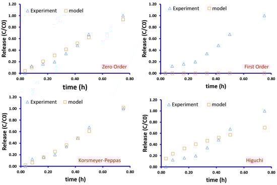 Figure 4 depicts the fitting between the experimental results and data from the models. Considering the zero-order model, there was a good fit between the experimental and model results with R2 equal to 0.987 and the K value equal to 1.247.