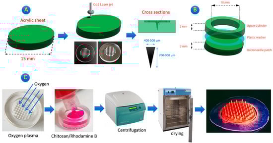 (A) The schematic protocol to create a microneedle mold, (B) components of the microneedle mold, and (C) the schematic process of creating MNP (preparing rhodamine-loaded MNP).