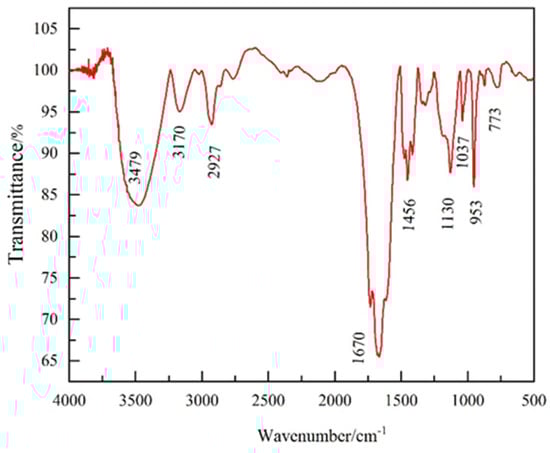 As shown in Figure 1, the broad peak of wavelength 3479 cm−1 is the stretching vibrational peak of the N-H bond, corresponding to the amide group. The peak at 3170 cm−1 is the stretching vibrational peak of C-H; 2927 cm−1 is the stretching vibrational peak of C-H, corresponding to the imidazolium ring substituent [29]; 1670 cm−1 and 1456 cm−1 are the backbone vibrational peaks of C=N and C=C, respectively; 773 cm−1 is the hydrocarbon planar out-of-plane oscillating bending vibrational peaks corresponding to the imidazole ring; 1037 cm−1 and 1456 cm−1 are methyl and methylene bending vibrational peaks corresponding to the methyl and methylene groups in DMC, respectively [30]. From the FT-IR analysis, it is clear that the synthesized PIL contains the characteristic functional groups of VAPIMBr, AM, and DMC, indicating that the synthesis is successful.