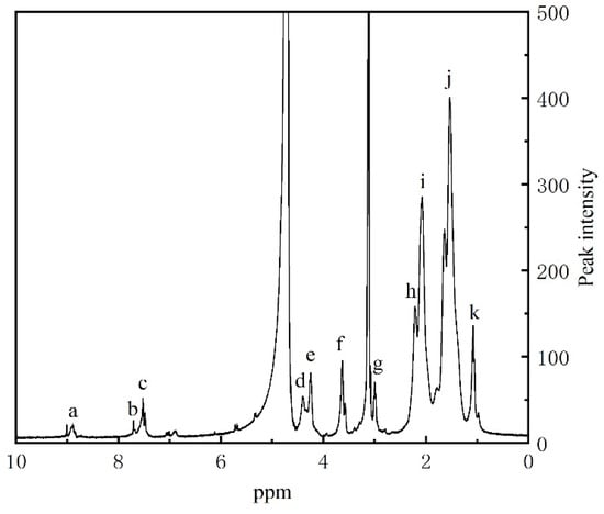 Nuclear magnetic resonance hydrogen spectroscopy (H-NMR) can be used to determine the molecular structure of polymers. The H-NMR spectrum of PIL was studied using an NMR spectrometer (Bruker Ascend-400, Fällanden, Switzerland). Deuterated chloroform was used as the solvent.