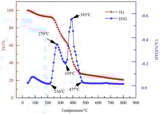 It can be seen from Figure 3 that a small amount of weight loss occurred before 155 °C, which was mainly caused by the volatilization of a small amount of water molecules in the sample. The subsequent thermal decomposition process was divided into three stages. The first stage was 155 °C–216 °C, in which the bound water of the amide group in the PIL molecular structure volatilized [31]. The second stage was from 216 °C to 477 °C, when a large amount of thermal weight loss occurred. The rapid decomposition of the polymer between 216 °C and 339 °C was caused by the decomposition of the polymer branched chains commencing. From 339 °C to 477 °C, the main chain of PIL was decomposed. In the third stage, the remaining substances in the polymer sample were continuously carbonized and decomposed after 477 °C.