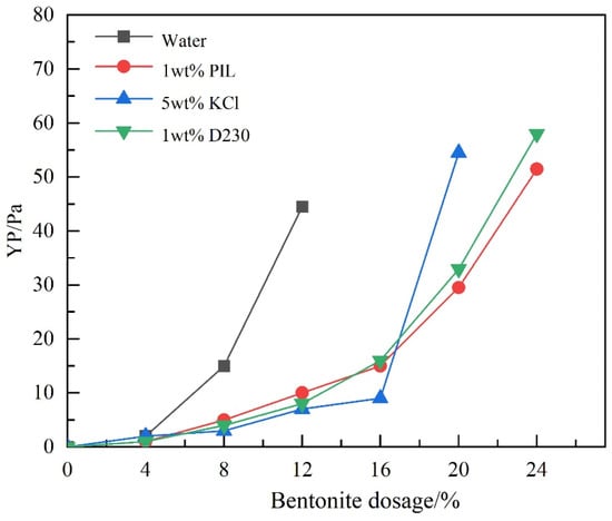 Variation of the yield point (YP) of different solutions with dosage of bentonite.