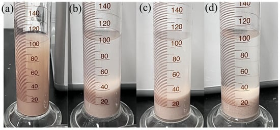 Results of bentonite flocculation experiment with different concentrations of PIL after 10 h: (a) deionized water, (b) 0.5 wt%, (c) 1 wt%, (d) 2 wt%.