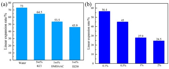 Linear expansion rate of artificial bentonite columns for 20 h: (a) in different inhibitor solutions, (b) in different concentrations of PIL solution.