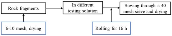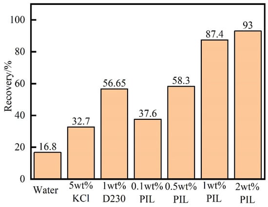In total, 6–10 mesh rock fragments were dried at 105 °C for 24 h. A total of 20 g of rock fragments were hot rolled under different test conditions in an aging tank for 16 h using a high-temperature roller heating furnace (Qingdao Tongchun Petroleum Instrument GW300-PLC, Qingdao, China). The hot-rolled rock fragments were sieved through a 40-mesh sieve. The remaining fragments on the sieve were dried in an oven at 105 °C for 24 h. Rolling recoveries of shale rock fragments were determined by aging in water, 0.1 wt%–2 wt% PIL, 5 wt% KCl, and 1 wt% D230, respectively. The flowchart is shown in Figure 17.