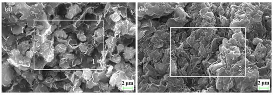 As shown in Figure 8a, the original bentonite was dispersed in flakes, with particle sizes ranging from a few hundred nanometres to dozens of micrometers, and the particle size distribution was uneven. After adding PIL to the bentonite slurry, the bentonite flakes were stacked and the particle size distribution became concentrated (Figure 8b). Table 1 shows the normalized mass ratios of the elemental analysis performed on the selected regions 1 and 2 in Figure 8, respectively. The bentonite surfaces of two regions were enriched in the oxygen, silicon, and aluminum elements, which was consistent with the theoretical chemical formula. The carbon content on the surface of the PIL-treated bentonite reached 17.78%, while the original bentonite was free of carbon. It indicated that PIL had been adsorbed onto bentonite.