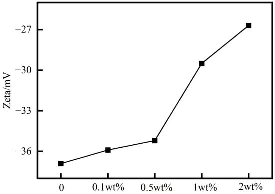 The bentonite slurry is a colloidal dispersion system formed by bentonite particles in deionized water, and the absolute value of the Zeta potential of the clay particles reflects the stability of the dispersion. After hydrolysis, PIL exhibits a positive charge due to the presence of cationic groups such as imidazole and ammonium on the side chains of the PIL molecule. Due to lattice substitution and other factors, bentonite carries a negative charge in water. As shown in Figure 9, the absolute value of the zeta potential decreased with increasing concentration of PIL in the bentonite slurry. This indicates that PIL could adsorb on the surface of bentonite, which is consistent with the SEM of bentonite results [22]. Colloidal systems with an absolute value of a zeta potential greater than 30 were considered stable. When the concentration was 2 wt%, the absolute value of the zeta potential still reached 27, indicating that PIL destabilized the dispersion of the prehydrated bentonite slurry, but to a lower extent [25].