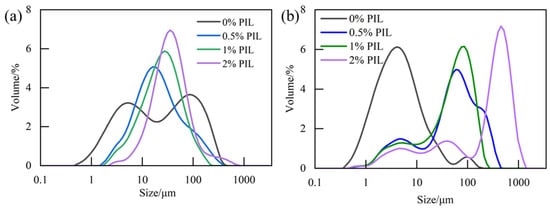 Particle size distribution of 4% bentonite slurry with different concentrations of PIL: (a) before aging, (b) after aging at 120 °C for 16 h.