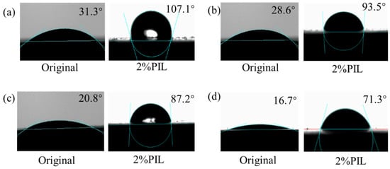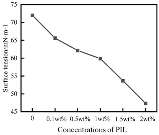 PIL solutions with concentrations of 0.1 wt%, 0.5 wt%, 1 wt%, 1.5 wt%, and 2 wt% were prepared, respectively. The surface tension of the PIL solution was tested using the hanging plate method, using a dynamic contact angle tensiometer (Dataphysics DCAT21, Filderstadt, Germany).