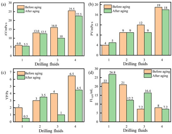 Rheological and filtration properties of drilling fluids before and after aging at 120 °C: (a) apparent viscosity (AV), (b) plastic viscosity (PV), (c) YP, (d) API filtration loss (FLAPI).