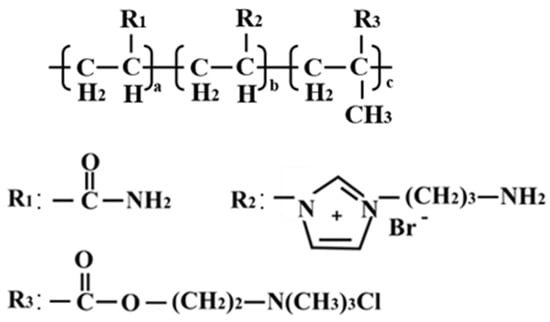 VAPIMBr, AM, and DMC were added into a flask containing water and stirred until fully dispersed. The mixture in the flask was heated to 55 °C and deoxidized with nitrogen for 30 min. Then, the initiator (potassium persulfate and sodium bisulfite) was added to the flask. The PIL was obtained after reaction for 7.5 h, washed with ethanol 2–3 times, and dried under 105 °C. The molecular structure of PIL is shown in Figure 14.
