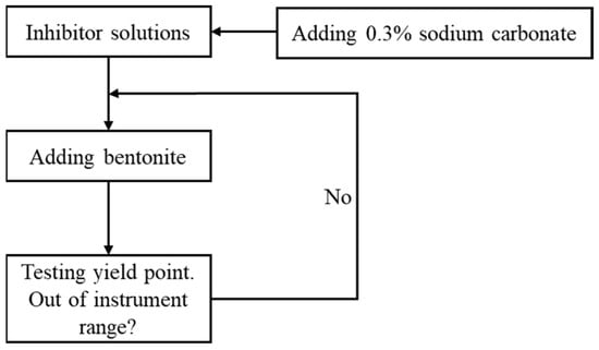 During the drilling process, the intrusion of bentonite-containing drill cuttings into the drilling fluid system can lead to changes in the rheological properties of the drilling fluid. Therefore, the slurrying ability of bentonite can be inhibited by adding inhibitors to the water-based drilling fluid. After adding 0.3% sodium carbonate to the different inhibitor solutions, a certain mass of bentonite was added to the different inhibitor solutions. The dispersion was stirred for 20 min. Then, the yield point (YP) was tested using a six-speed rotational viscometer (Qingdao Tongchun Petroleum Instrument, Qingdao, China). When YP exceeded the measurement range of the instrument, the addition of bentonite to the solution was terminated. The flowchart is shown in Figure 15.