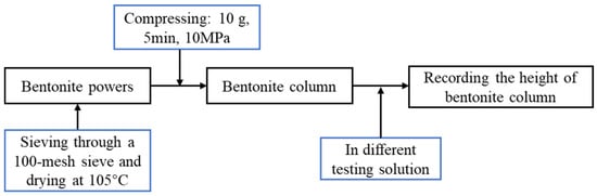 Bentonite was sieved through a 100-mesh sieve and dried at 105 °C. Then, an artificial bentonite column was prepared by adding 10 g of bentonite powder to the pressure cylinder at 10 MPa for 5 min [35]. The height of bentonite columns in different test solutions for 20 h was recorded using a dual-channel pycnometer expansion meter (Qingdao Tongchun Petroleum Instrument, Qingdao, China). The above method was adopted to evaluate the linear expansion of the bentonite column in deionized water, 0.1 wt% PIL, 0.5 wt% PIL, 1 wt% PIL, 2 wt% PIL, 5 wt% KCl, 1 wt% DMDAAC, and 1 wt% D230, respectively. The flowchart is shown in Figure 16.