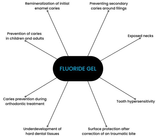 Fluoride gels are commonly recommended by professionals [6,7]. Their application is approved by the US Food and Drug Administration. Dental gels consist of fluoridated and acidic ingredients. Their pH usually ranges between about 3.2 and 7.7 [8,9]. Fluoride gels are available in the forms of acidulated phosphate fluoride (APF) and neutral sodium fluoride. The concentration of fluoride ranges from 1000 to 12,300 ppm. They can be applied at a dental office by a medical professional or self-applied [10]. Fluoride gels are recommended in cases of enamel demineralization, dentine hypersensitivity, and moderate or high caries risk, e.g., among patients with xerostomia, fixed orthodontic appliances, and vulnerable elders [11,12]. A study comparing fluoride gel to a placebo exhibited a preventive fraction of 21% [13]. The main areas of fluoride gels’ application are depicted in Figure 1.