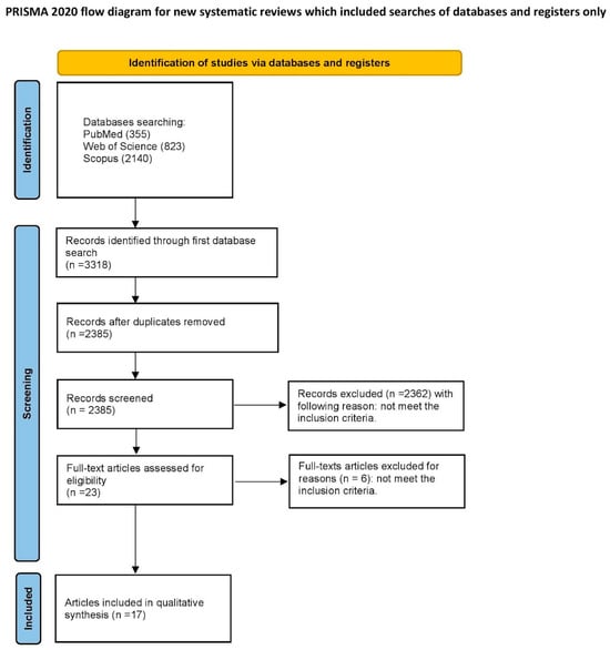 An initial search of the database identified 2385 articles that were potentially eligible for the literature review. After screening the titles and abstracts, 2362 articles were excluded as they were unrelated to the reviewed topic. Among the remaining 23 articles, there were no duplicates. After a full-text examination, six articles were rejected due to not meeting the inclusion criteria. Finally, 17 articles qualified for the systematic review [8,12,24,25,34,35,36,37,38,39,40,41,42,43,44,45,46]. All of the included studies were written in English and were either in vitro or in vivo studies. Their scope was the influence of fluoride gels on the physiochemical properties of dental materials and tissues.