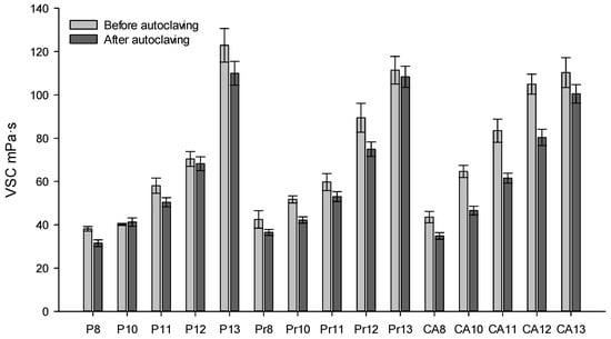 Viscosity (mPa·s) of experimental eye drops at room temperature (21 ± 1 °C) at the beginning of production and after sterilization using high-pressure steam.