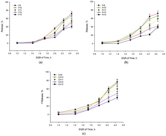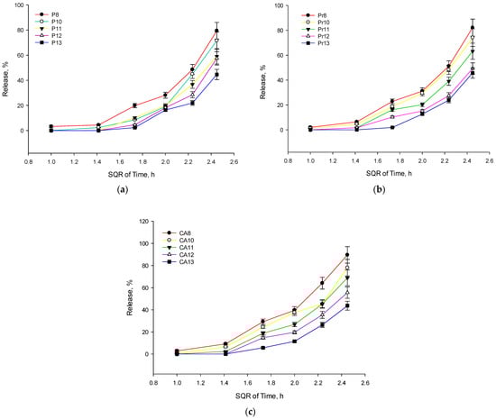 Higuchi equation for release kinetic (square root of time) of total phenolic compounds and p-coumaric acid from experimental eye drop formulations, mean ± SD, n = 3. Graph (a) shows release kinetics of formulations with balsam poplar bud extracts, graph (b)—propolis extracts, and graph (c)—with p-coumaric acid solutions.