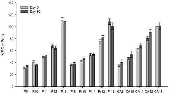 Viscosity (mPa·s) of experimental eye drops at room temperature (21 ± 1 °C) on production day 0 and 90 days post-production.
