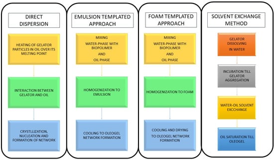 A number of methods are used for oleogelation (Figure 2) depending on the physico-chemical properties of the oleogelator and the requirements of the final product. Among these, solvent exchange, cooling and crystallization, high-pressure homogenization, physical mixing, and emulsification are the most commonly used [27]. A solvent exchange technique in which the oleoelator is dissolved in a solvent miscible with the oil phase is used. After cooling, the solvent is meticulously removed, leaving a stable gel network [23,24,25,26]. Some oleogelators typical of waxes participate in the oleogelation process by crystallizing at temperatures below their respective melting points, thereby coalescing to form a gel matrix [27]. High-pressure homogenization is used to break up the oleogelator particles, thereby reassembling them into a coherent gel structure—an industrially relevant method for various oleogelating applications [28]. Mechanized mixing and the application of shear forces are used to disperse oleogelators in the oil phase, nurturing their final gelation after cooling. Oleogelation by emulsification entails the formation of an oil-in-water emulsion, with the aqueous phase containing the oleogelator. The subsequent removal of water culminates in the appearance of a gel structure in the oil phase [22].