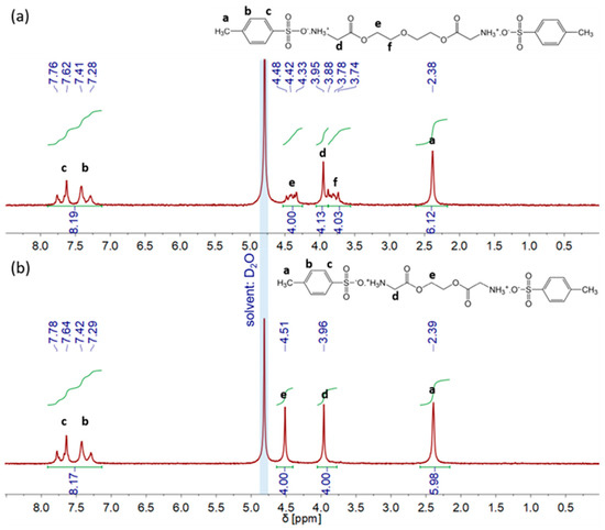- 7.56–7.21 (d, 8H, 2Ar-H), 4.34 (t, 4H, COOCH2CH2), 3.88 (s, 4H, NH3+CH2), 3.75 (t, 4H, COOCH2CH2), and 2.31 (s, 6H, Ar-CH3).