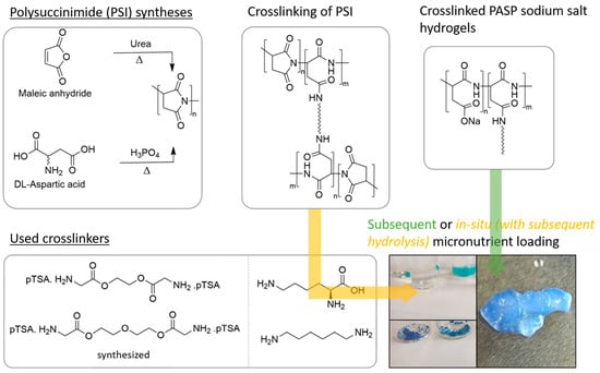 - Xu, J.; Kim, K.O.; Yoon, K.J. Effect of Cross-Linker Length on the Absorption Characteristics of the Sodium Salt of Cross-Linked Polyaspartic Acid. Polymers 2022, 14, 2244. [Google Scholar] [CrossRef]