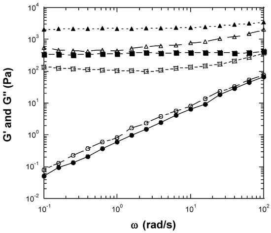 Linear viscoelastic properties measured by conventional mechanical rheometer for 25, 27.5, and 30 wt% inulin. Storage modulus (G′) or loss modulus (G″) vs. frequency at 25 °C with 0.08% strain. G′ is indicated using filled symbols, while G″ is indicated using opened symbols. (●, ○): 25 wt% inulin. (■, □): 27.5 wt% inulin gel. (▲, △): 30 wt% inulin gel.