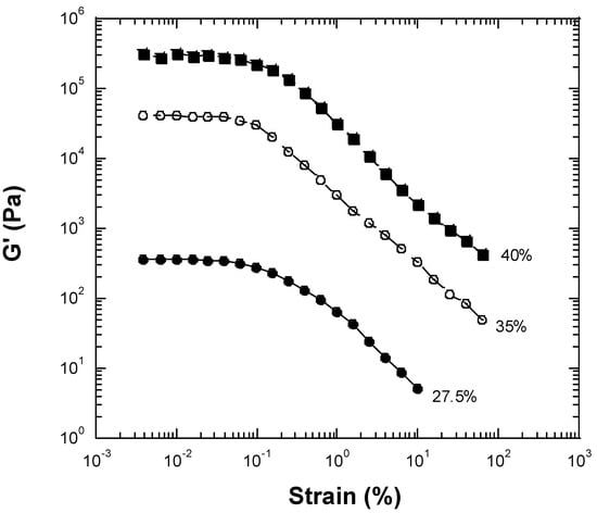 Results of strain sweep experiments for inulin gels measured using a conventional mechanical rheometer operating at 1 rad/s frequency and a temperature of 25 °C. (●): 27.5 wt% inulin gel. (○): 35 wt% inulin gel. (■): 40 wt% inulin gel.