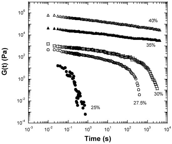 A gel is normally formed through the chemical (covalent) or physical cross-linking of polymer chains into a three-dimensional network. To investigate whether the prepared inulin gels were chemically or physically cross-linked networks, stress relaxation experiments were conducted (Figure 4). As seen in the figure, the 25 wt% inulin sample was immediately fully relaxed within a second after an initial step change in shear strain within the linear range. This result indicates no network or gel formation for the 25 wt% inulin, which is in agreement with the above fact that 25 wt% inulin exhibited fluid-like behavior rather than gel-like behavior. In contrast, the 27.5 wt% inulin sample relaxed more slowly and fully relaxed after approximately 300 s (Figure 4). As the inulin concentration increased to 30 wt%, the gel took 1000 s to fully relax (Figure 4). Finally, the 35 wt% and 40 wt% inulin gels relaxed very slowly and did not fully relax even after 3000 s (Figure 4). These results demonstrate that the inulin gels are composed of three-dimensional, physically crosslinked networks as opposed to being chemically crosslinked. If the gels were chemically crosslinked, no relaxation would be observed, and the relaxation time would be infinite. Thus, based on these relaxation time results, the inulin gels prepared in this study consist of physically crosslinked networks due to chain–chain interactions and entanglements that become more prevalent as the concentration of inulin increases.