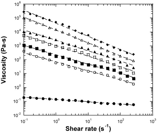 Plots of viscosity vs. shear rate measured using a conventional mechanical rheometer for the 25 wt% (●), 27.5 wt% (○), 30 wt% (■), 32.5 wt% (□), 35 wt% (▲), 37.5 wt% (△), and 40 wt% (◆) inulin dispersions at 25 °C. Dashed lines are fitted results by the power law model (Equation (1)).