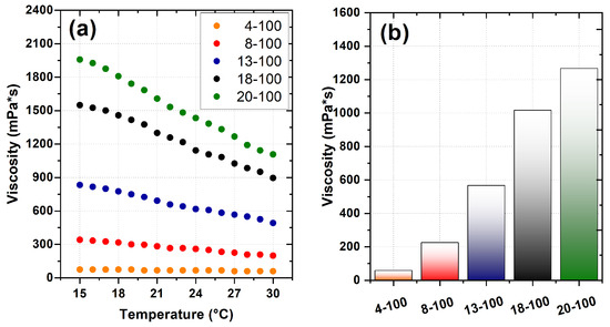 PVA stock solutions were prepared by dissolving PVA powder in water at 12.4% w/w concentration. Then, PVA solutions were mixed according to the proportions reported in Table 6 (Section 4). Before the gelation of the samples, the viscoelastic properties of the PVA mixture solutions were analyzed. First of all, the viscosity of the PVA solutions was measured by setting the fixed shear speed and increasing the temperature from 15 to 30 °C. For all samples, the viscosity decreased with increasing temperature, as shown in Figure 1a and Figure S1. In fact, at higher temperatures, the molecular vibrations are greater and, consequently, the intermolecular interactions are less stable and, therefore, weaker than at lower temperatures. Then, the viscosity of the stock solutions at 27 °C was compared (Figure 1b). As expected, the viscosity of the solutions increased with the increasing molecular weight (MW) of the PVA (4-100 > 8-100 > 13-100 > 18-100) because larger molecules encounter more resistance to movement compared to smaller molecules. The viscosity measurement of the polymer solution is, in fact, a common strategy used to determine the size of the polymer, leading to the chain length and MW.