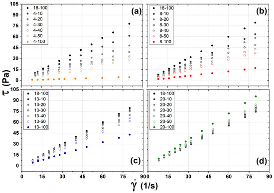 Figure 2 shows the shear stress (τ) as a function of a shear rate () for all the PVA mixture solutions, fixing the temperature at 27 °C. This plot displays a linear increase in stress with increasing shear rate, suggesting a Newtonian property for all the PVA solutions regardless of MW and HD. According to Newton’s laws, the viscosity η of PVA solutions, as given by the slope of the plotted line, remains constant independent of the rate of shear and, as already observed in Figure 1b, it only depends on the temperature. The viscosity analyses also showed that the viscosity of the PVA solution can be finely modulated by mixing PVA with different MWs and HDs (Figure 2 and Figure S1).