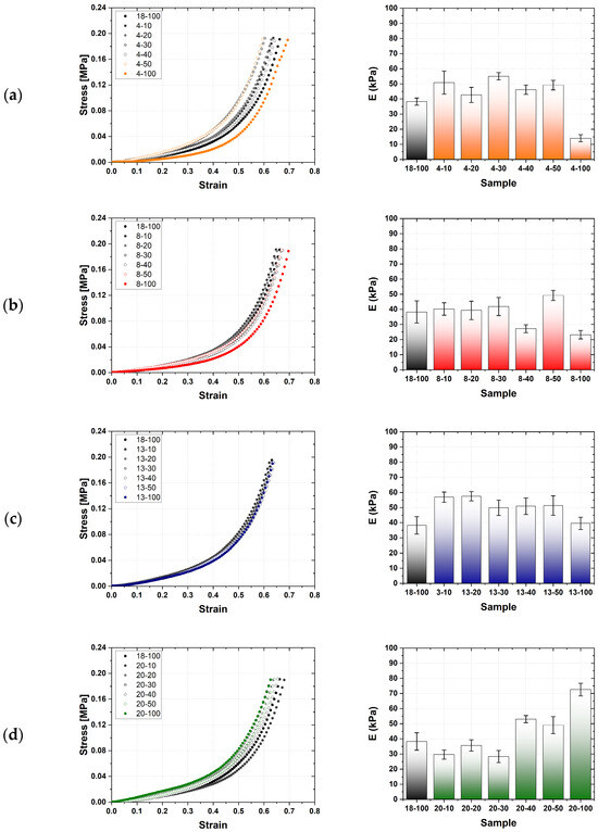 However, differences in the evolution of Young’s modulus as a function of the PVA hydrogel mixing ratio can be pointed out. Series 4- (Figure 3a) and 8- (Figure 3b) PVA samples did not show a continuous decrease in mechanical strength by increasing the amount of 4:88 and 8:88 PVA in the mixture. Rather, it seems that the PVA with the highest MW (18:88) has a predominant effect in determining the overall Young’s modulus of the hydrogel with respect to the PVAs with lower MWs (4:88 and 8:88). This can also be evidently seen from the stress–strain plots, where the curves of the -10, -20, -30, -40, and -50 samples gathered around that one of sample 18-100.