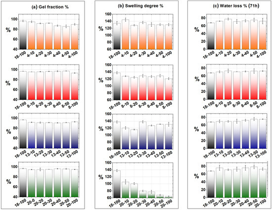 From the macroscopic point of view, the ability of PVA hydrogels to absorb water arises from -OH groups of the polymer backbone, while their resistance to dissolution arises from crosslinks between polymer chains [43]. These two parameters can be studied through the estimation of SW% and GF% coefficients (Figure 4a,b).