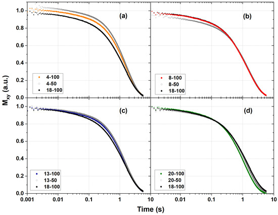 Transverse nuclear relaxation decay curves of the samples: (a) 4-100, 4-50 and 18-100; (b) 8-100, 8-50 and 18-100; (c) 13-100, 13-50 and 18-100; (d) 20-100, 20-50 and 18-100.