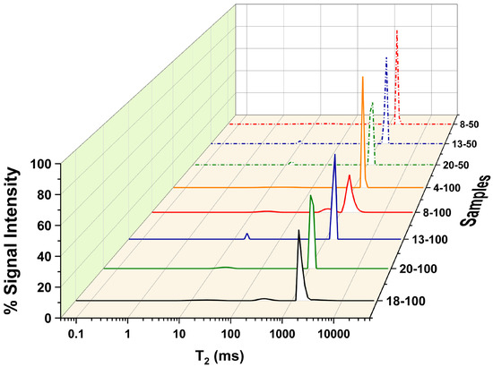 The transverse decays of all the samples are reported in Figure 5. When plotting the exponential decay in a semilog scale, as shown in Figure 5, with the first part of the curve zoomed, the fastest part of the decay is clearly shown. Indeed, the curves indicate the presence of more than one component that constitutes T2 exponential decay (also called spin–spin nuclear relaxation times).