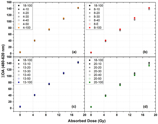 Figure 7 illustrates the trend of the cumulative optical absorbance versus absorbed dose for PVA-GTA-FG, arranged according to the PVA mixtures detailed in Table 6. The optical response consistently increases within the investigated dose range (0–18 Gy), aligning with the findings reported in the literature for an FG made with other PVA types [18,28]. Subsequently, the experimental data underwent linear regression analysis, where the slope of the fitted line served as an indicator of optical dosimetric sensitivity (see Table S1). Remarkably, a consistent linear trend was observed for all preparations, with an R2 value exceeding 0.999.