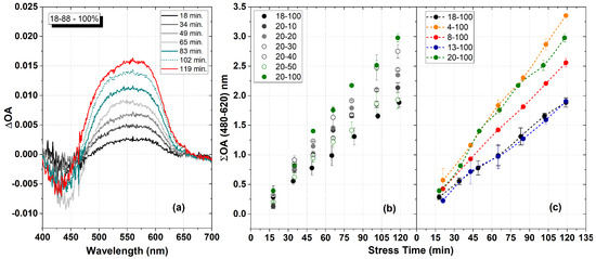 All of the experimental data were fitted with a linear function of a free intercept. Figure 8c shows the obtained results for the pure PVA-GTA-FG. It can be observed that for all of the considered preparations, as the stress time increases, the integral optical absorbance value increases.