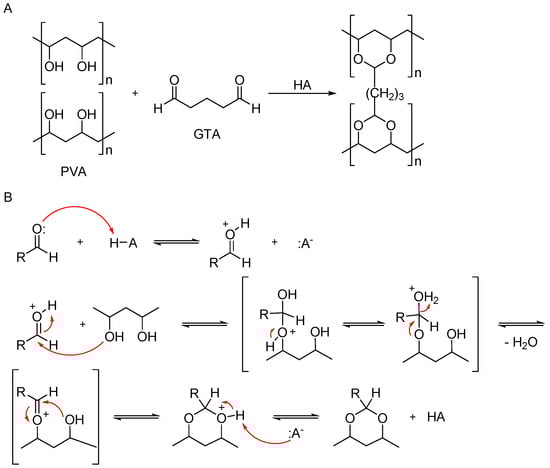 (A) Crosslinking reaction between PVA and GTA. (B) Mechanism of the acetylation reaction between a hydroxyl-containing polymer and an aldehyde.