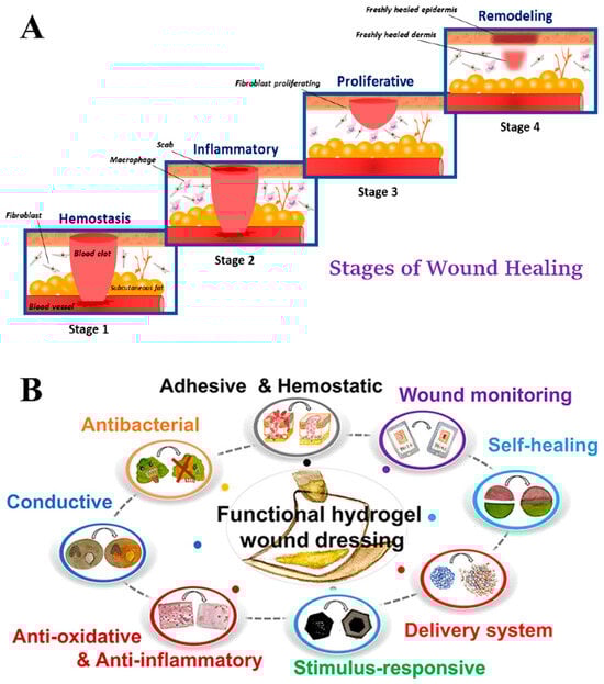 (A) The four stages of wound healing: hemostasis, inflammation, proliferation and remodeling [20]. (B) Various properties of multifunctional hydrogel wound dressings used for wound healing [26].