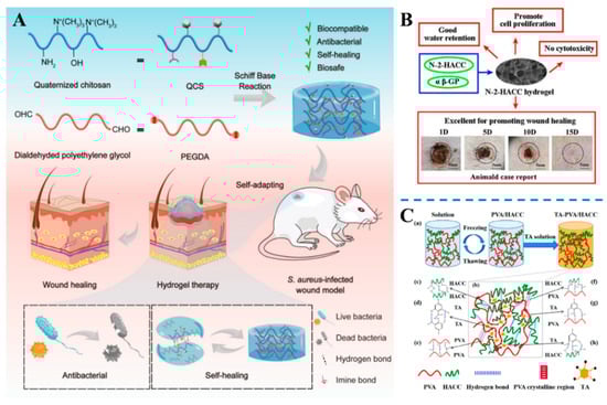 (A) The dynamic antibacterial hydrogel dressings prepared using quaternized chitosan (QCS) and dialdehyded polyethylene glycol (PEGDA) [75]. (B) Hydrogels prepared using N-2-HACC promote wound healing [76]. (C) A double-network hydrogel based on HACC, TA, and PVA was fabricated using a combination approach of cyclic freeze–thaw and soaking methods [77].