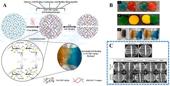 (A) N,O-carboxymethyl chitosan hydrogel with the incorporation of silver nanoparticles possesses adhesive, conductive, (B) self-healing, (C) antibacterial, and anti-biofilm properties [76].