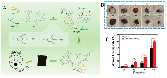 (A) Oxidized tannic acid-crosslinked carboxymethyl chitosan (CMCS) hydrogels incorporating silver nanoparticles exhibit good antibacterial properties and cytocompatibility, and the obtained hydrogel dressing could promote wound repair in a rat infection model (B,C) [78]. ** p < 0.01.