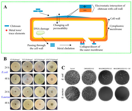 (A) Schematic diagram of the antibacterial mechanism of chitosan [106]; (B) the antibacterial results of a GVCS hydrogel [108]; (C) the HB-QCMCS/PEG hydrogel’s antibacterial results [109].