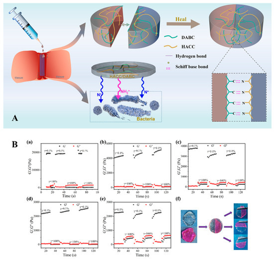 The self-healing ability of hydrogel comes from the fact that, under appropriate conditions, the hydrogel can be recombined and reconnected after suffering external damage [121]. The groups on the chitosan molecular chain endow chitosan-based hydrogel with self-healing ability and antibacterial, hemostatic, and other properties [122,123]. The self-healing mechanism of hydrogel lies in forming a dynamic or reversible network structure via chemical covalent bonds (such as imine bonds, disulfide bonds, etc.) or physical non-covalent bonds (such as hydrogen bonds, hydrophobic bonds, etc.). These hydrogels with excellent self-healing properties also exhibit better persistence, responsiveness, and plasticity. Deng et al. prepared multifunctional chitosan-based hydrogels with self-healing ability via dynamic Schiff bases between amino groups in quaternary ammonium chitosan and aldehyde groups in dialdehyde bacterial cellulose (DABC) (Figure 8A) [124]. Li et al. used HACC and benzaldehyde-terminated polyethylene glycol (POSS-PEG-CHO) to produce a dynamic hydrogel network, and the resulting multifunctional hydrogel exhibited good self-healing properties [125]. Yu et al. used quaternary ammonium oxide guar gum (OQGG) and carboxymethyl chitosan to form a gel through the reaction of the Schiff base and prepared a hydrogel with self-healing, antibacterial, and other functionality (Figure 8B) [126].