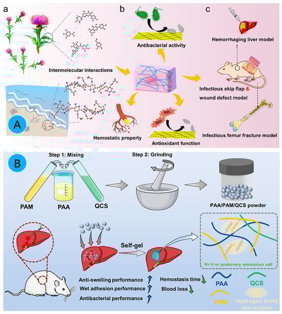 (A) Schematic representation of a CECS hydrogel, prepared with a mixture of carboxymethyl chitosan (CS) and traditional medicinal herb extracts (CE), which exhibits antibacterial, antioxidant and hemostatic activities in vitro and has shown good therapeutic effects in a model of hepatic hemorrhage, a model of skin flap infection, a model of an infected wound defect, and a model of infected femoral fracture [148]; (B) schematic diagram of the formation of PAA/PAM/QCS self-gelatinizing hemostatic powder and its application in hemostasis [149].