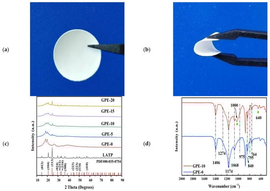 (a) Photographs of the GPE-10’s flat view; (b) photographs of the GPE-10’s bend diagram; (c) XRD patterns of PVDF-HFP incorporating varying amounts of LATP; (d) FT-IR patterns of GPE-10 and GPE-0.