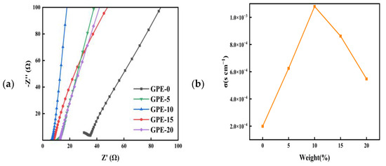 Given its critical significance in battery performance, ionic conductivity measurement is imperative when examining the impact of varying LATP quantities on GPE. As can be seen from Figure 2a, each Nyquist plot consists of a semicircle at high frequencies and a slant line at low frequencies. The high-frequency semicircle represents the electrical conductivity in the block and within the crystal in GPE. The low-frequency tilt line is related to lithium-ion diffusion [28]. The abscissa of the junction between the low-frequency and high-frequency parts in the diagram is the volume resistance. The ionic conductivity is calculated from Equation (2), where R is read directly from the real part of the X-axis in the Nyquist plot, also at the junction of the semicircle and the inclined lithium-ion diffusion line. At 25℃, the volume impedance of GPE-10 is the smallest, and the volume impedance of GPE-0 is the largest. In the presence of well-dispersed LATP in the PVDF-HFP hybrid network, the crystallinity of the polymer electrolyte is lower and the resistance is reduced. Figure 2b showcases the Nyquist plots representing the samples with varying additions of LATP. The ionic conductivity of each sample was determined using Equation (2) for calculation. The ionic conductivities of GPE-0, GPE-5, GPE-10, GPE-15, and GPE-20 were ~2.0, 8.6, 10.8, 6.3, and 5.5 × 10−4 s cm−1, respectively, at 25 °C. The incorporation of LATP augmented the ionic conductivity of the electrolyte membrane. This enhancement is attributable to the intensified site-blocking influence exerted by the inorganic filler, LATP, which promotes the expansion of the amorphous phase within PVDF-HFP [29]. Consequently, the increased disorder and freedom of the organic chains facilitate a higher level of ionic conductivity within the electrolyte. Nonetheless, when the LATP content was increased to 20%, the high LATP content hindered the free movement of ions, resulting in a significant decrease in ionic conductivity [30,31].