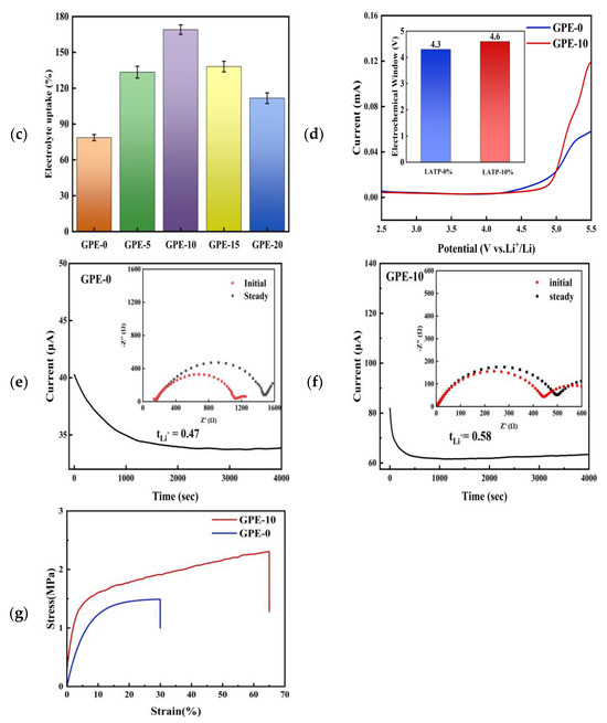 The results of the liquid absorption test for GPE with different LATP contents are plotted in Figure 2c. The liquid electrolyte uptake of samples with different LATP content was 79.7%, 133.7%, 168.6%, 138.2% and 111.5%, respectively. The liquid uptake rate of GPE increased after the addition of LATP, and GPE could absorb more liquid electrolytes thus having a higher ionic conductivity. GPE-10 was chosen for subsequent studies because of its superior ionic conductivity and liquid absorption rate.